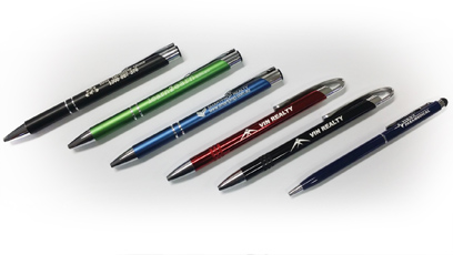 Engraved pens are available in different colours and styles. A popular and affordable promotional item