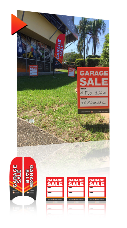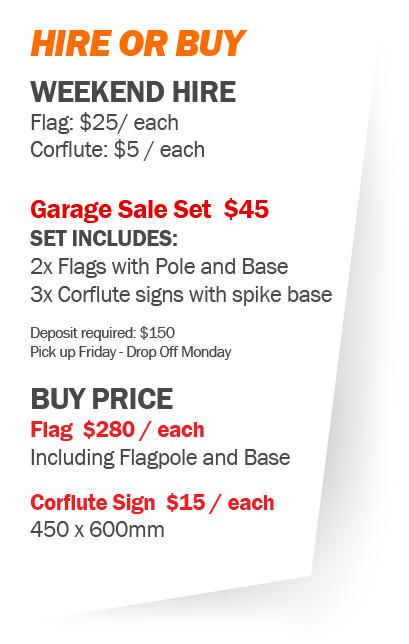 Maximise your garage sale success with the use of these eye catching corflute garage sale signs and garage sale flags. Forget the tacky looking cardboard signs, use something that ACTUALLY grabs people’s attention.